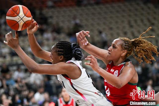 7月13日,2025女篮亚洲杯在广东深圳开赛,日本女篮72:68战胜黎巴嫩女篮。图为黎巴嫩球员Jillian Archer(右)与日本球员Stephanie Mawuli在比赛中拼抢球权。中新社记者 陈骥旻 摄