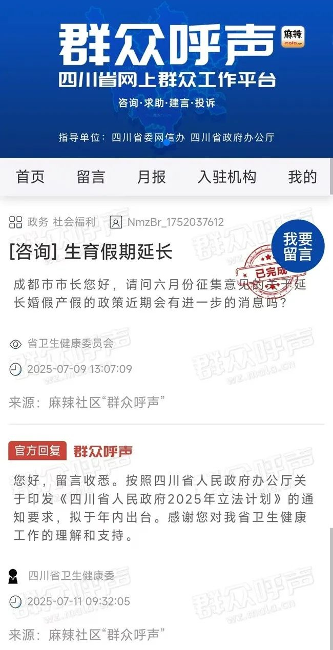 今年6月,四川省卫生健康委员会官网发布《四川省人口与计划生育条例(修正草案征求意见稿)》,拟对婚假、生育假等内容进行调整,主要内容一是婚假延长至20天,自愿参加婚前医学检查的再增加5天婚假。二是将四川生育假延长为生育一孩90天,生育二孩120天,生育三孩150天。三是男方护理假延长至30天。