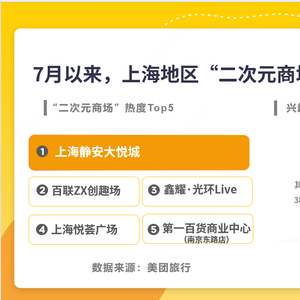 美团数据显示,7月以来,上海地区“二次元商场”搜索量较上月同期增长超10倍,从搜索人群看,年龄在20~35岁人群占比达到62%。其中,Top5的商场分别为:上海静安大悦城、百联ZX创趣场、鑫耀·光环Live、上海悦荟广场、第一百货商业中心(南京东路店)。