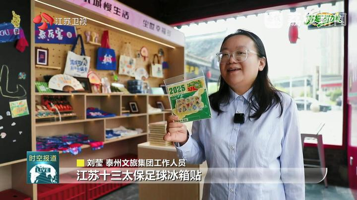 泰州文旅集团工作人员刘莹说:“不管是T恤衫还是帆布包都颇受好评。像我手上这款江苏十三太保足球冰箱贴,囊括了13个地级市的卡通形象。还有我手上这柄‘泰厉害’蒲扇,既融合了传统手工艺元素,又用鲜艳的亮色吸引了年轻人的注意。”