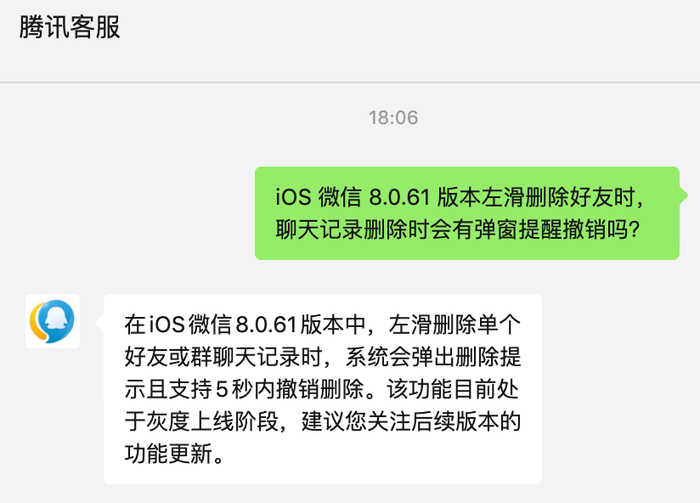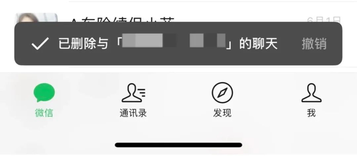 如上图所见,iOS端微信更新至8.0.61版本后,在左滑删除单个好友或群聊天记录时,系统会弹出一个“撤销”提醒,用户可以在5秒内撤销删除。