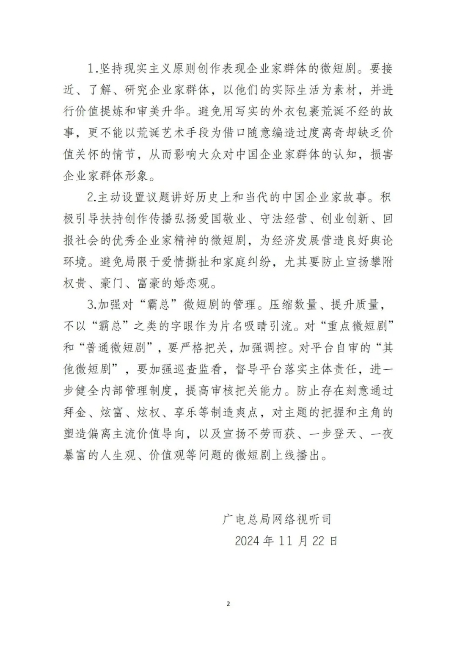 2024年我国微短剧市场规模达504.4亿元,超过内地电影全年总票房收入。微短剧作为市场大盘,应该被引入更加规范的管理。去年,针对“霸总”微短剧这类同质化严重的微短剧,广电总局出具了相关管理提示。