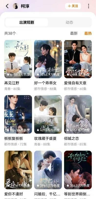 作为短剧F4之一的柯淳,应该是今年热度最高的一位短剧男演员。在今年二月份播出的《好一个乖乖女》中,他饰演的是对女主一见钟情,甘愿被利用的香江段家二公子段休冥。这部红果总播放量破10亿,抖音主话题6亿+的现象级短剧奠定了柯淳“短剧一哥”的地位。点进他的红果主页,出演短剧有38部,光是演霸总就演了34部,霸道总裁似乎也成了他身上最“闪亮”的标签。