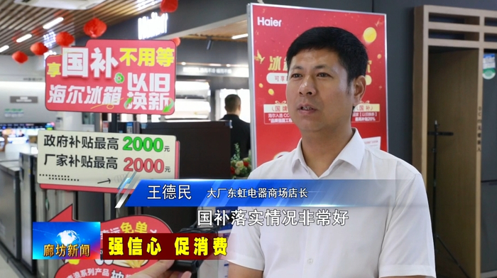 大厂东虹电器商场店长 王德民:国补落实情况非常好,像我们卖场95%以上的产品都可以参与国补,就目前销售情况看,我们整体的销售额、销售业绩都是积极向上,一个往上走的良好状态。