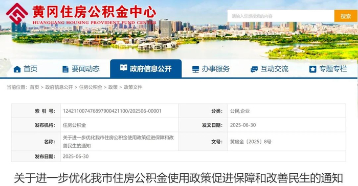 6月30日,黄冈市住房公积金管理中心发布《关于进一步优化我市住房公积金使用政策促进保障和改善民生的通知》。政策执行期暂定一年,即从2025年7月1日至2026年6月30日。