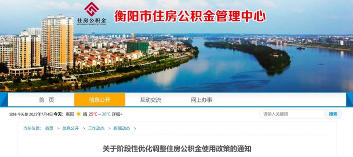 6月27日,衡阳市住房公积金管理中心发布《关于阶段性优化调整住房公积金使用政策的通知》。该通知自2025年7月1日起施行。