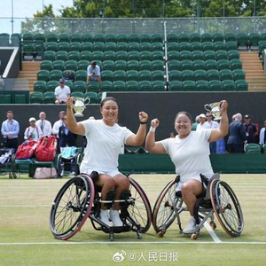 7月13日,在2025温网轮椅网球下肢组女双决赛中,中国组合王紫莹/李晓辉以6-3、6-1战胜贝纳尔/夏托,夺得两人合作以来的第二座大满贯冠军。前一天,王紫莹在女单赛场夺冠,成为中国轮椅网球首位大满贯单打冠军。