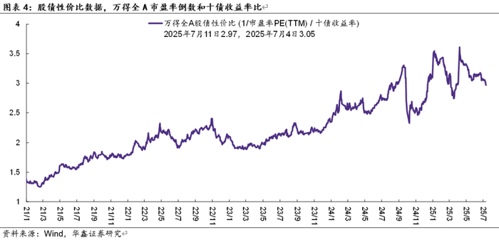负债端。最新更新的数据显示,2025年5月实体部门负债增速录得8.9%,前值9.0%,基本符合预期。以月末时点数衡量,预计4月形成年内实体部门负债增速的高点,6月实体部门负债增速转而下行至8.8%附近,7月反抽至4月高点附近,后续转而下行,重回缩表。按照两会公布的财政计划,我们预计年底实体部门负债增速将下降至8%附近。金融部门方面,上周资金面边际上有所收敛,我们认为,6月初以来资金面松弛的顶点基本出现在7月4日、7日、8日三个交易日期间,而实体部门在6月底至7月初之间,大体上有三周左右扩表,即6月30日至7月12日附近。在流动性边际收敛大背景之下,我们关注的重点仍是股债性价比何时重回偏向债券。2025年政府工作报告中明确指出:“使社会融资规模、货币供应量增长同经济增长、价格总水平预期目标相匹配”,这表明,稳定宏观杠杆率的大方向没有任何动摇,中国仍然处于边际缩表过程之中,大规模化债进一步降低了地方政府融资成本、以及发生大规模违约和流动性风险的概率,有利于提升全社会的预期。
