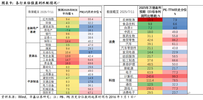 估值盈利匹配方面,截至2025年7月11日,2024年全年盈利预测较高,且当下估值相对历史偏低的行业有银行、煤炭、石油石化、交通运输、美容护理、消费电子。