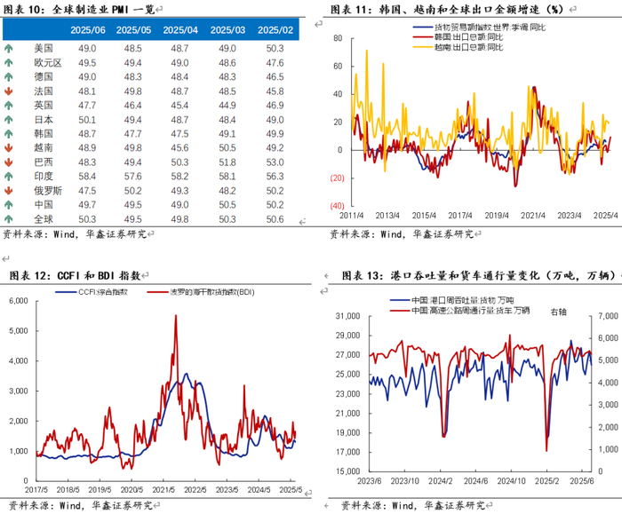 外需方面,普遍回升。6月全球制造业PMI自49.5升至50.3,主要经济体PMI多数回升。CCFI指数最新一周环比下跌2.18%。港口货物吞吐量下降。韩国6月月出口增速自-1.3%升至4.3%,7月前10日升至9.5%。越南出口增速自5月的20.7%微降至6月的19.3%。