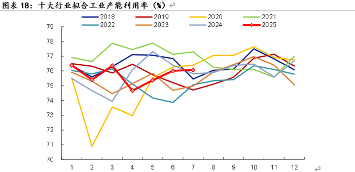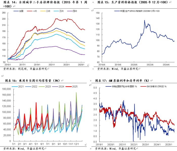 内需方面,最新一周二手房价格下跌,数量指标涨跌互现。高速公路货车通行量走低, 2025年4月十行业拟合的产能利用率明显回落,5-6月回升,7月延续小幅回升。汽车成交量处于历史同期较高水平,新房成交持续处于历史最低,二手房成交相对历史季节性回落。截至7月6日,全国城市二手房挂牌价指数较上周环比下降0.27%。截至7月4日,生产资料价格指数较上周环比上涨0.6%。