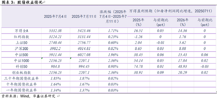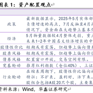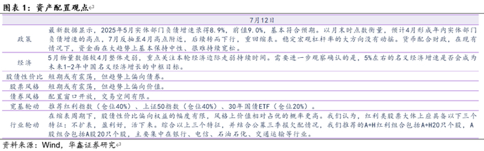 在2025年两会后,我们进一步坚定了趋势上对国家资产负债表两端的判断。截至目前年内共有两次扩表,第一次发生在1月中(1月13日当周)至2月中(即2月17日当周),横跨春节共计6周,资金面配合程度不强,期限利差大幅压缩,在一系列消息扰动下,扩表末端、缩表初端风险偏好的提升超出了我们的预期。第二次发生在6月底(6月23日当周)至7月初(7月7日当周),共计3周,资金面配合程度较好。最新数据显示,以月末时点数衡量,4月有望形成年内实体部门负债增速的高点,7月反抽至4月高点附近,后续转而下行,重回缩表。我们认为,6月初以来资金面松弛的顶点基本出现在7月4日、7日、8日三个交易日期间。本周继续重点关注股债性价比能否重回偏向债券。美国目前的情况与互联网泡沫破裂时(2001年)非常相似,川普政府一系列逆全球化操作,也正是上述经济背景下看似偶然、实则必然的结果。最新公布的数据显示,美国一季度实际GDP同比增长2.0%,虽然低于过去三年的经济增速(2.5%、2.9%、2.8%),但仍然高出美联储给出的趋势水平(1.8%),目前包括美联储在内的国际主流机构对美国今年经济增速的预估都是回归趋势水平附近,我们重点关注后续美国季度实际GDP同比增速能否以及何时跌破趋势水平。债市方面,一年期国债收益率高于目前政策利率对应的区间下沿,或在中枢位置附近,上行风险不大。缩表周期下股债性价比趋势性偏向债券,而权益风格趋势性偏向价值;综合而言,我们认为目前点位下长债性价比略优于价值类权益资产,后续如果权益类价值资产继续下跌,或能出现较好的介入窗口。本周我们推荐红利指数(仓位40%)、上证50指数(仓位40%)、30年国债ETF(仓位20%)。