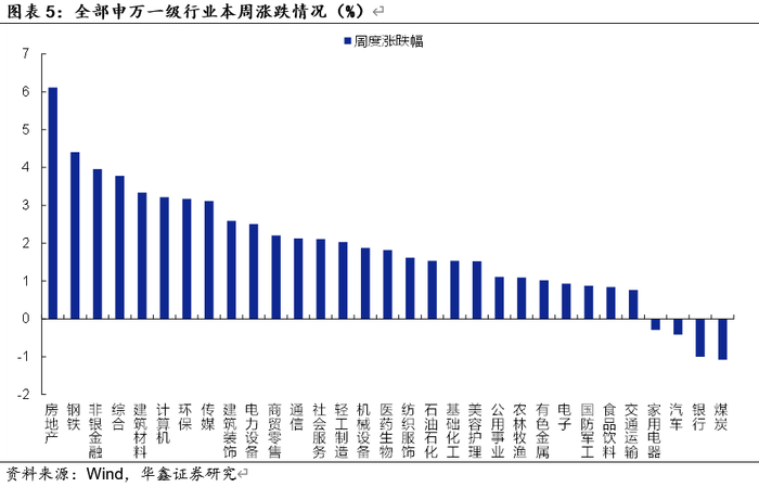 本周A股上涨,成交量与上周接近。上证指数涨1.1%,深证成指涨1.8%,创业板指涨2.4%。申万一级行业中房地产、钢铁、非银金融、综合、建筑材料涨幅最大,本周分别上涨6.1%、4.4%、4%、3.8%、3.3%,煤炭、银行、汽车、家用电器跌幅最大,周跌幅分别在1.1%、1%、0.4%、0.3%。