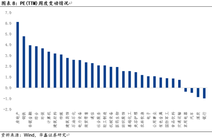 本周申万一级行业PE(TTM)中房地产、钢铁、非银金融、综合、环保涨幅最大,变动幅度分别在6.1%、4.8%、3.9%、3.8%、3.7%,银行、煤炭、汽车、家用电器跌幅最大,估值变动幅度分别在-1%、-0.9%、-0.5%、-0.4%。