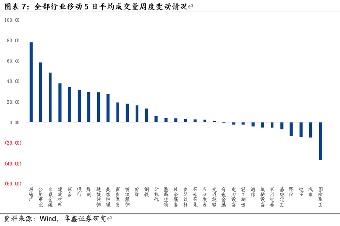 本周全A日均成交量1.5万亿元较上周1.44万亿元微升。房地产、公用事业、非银金融、建筑材料、综合成交量同比增速最高,成交量变动分别在78.3%、58.3%、48.6%、37.8%、34.5%。国防军工、汽车、电子、环保、基础化工成交量涨幅最小,成交量变动分别在-36.7%、-15%、-14.4%、-12.8%、-6.8%。