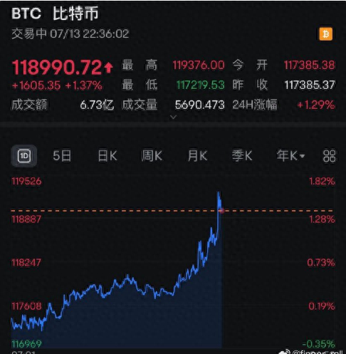 周日晚间,比特币突然异动直线拉升,截至发稿,比特币涨幅超1%。盘中一度突破119000美元,再创历史新高。