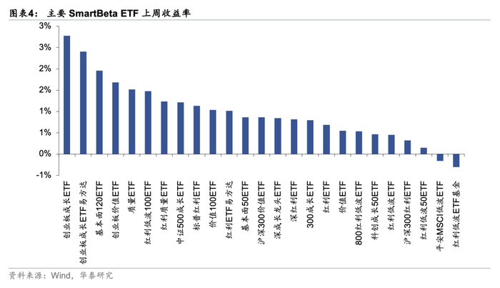 上周A股市场延续普涨行情,全市场成交额于7月11日重回1.7万亿元以上,交易情绪相对高涨,其中微盘股指数以2.69%的周涨幅领涨市场。从风格上来看,成长、小盘风格上周表现依然相对占优:1)宽基ETF中,创业板50ETF上周上涨2.64%位居前列,中证2000ETF、国证2000ETF等小盘风格的指数产品周度收益率也均在2%以上;2)SmartBeta ETF中,成长相关ETF上周收益表现继续占优,相关产品的周度收益率均高于红利、低波类ETF产品;3)行业ETF中,房地产及其相关板块上周涨势较强,房地产ETF上涨6.42%,钢铁ETF上周4.16%,位居行业ETF产品前列。