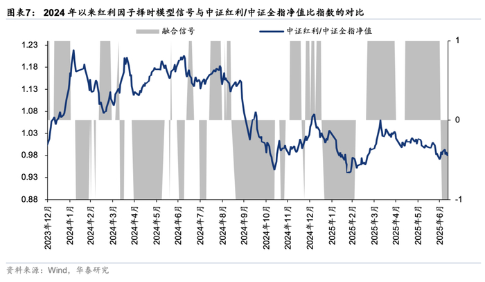 对于A股内部风格板块轮动较快的特点,我们针对其中的红利因子和市值因子也构筑有与其风格特征相匹配的择时模型。其中,红利因子长期表现相对温和,趋势追踪效果较好,因此,我们主要选用了因子净值本身的趋势、国内国债期限利差(10年期-1年期)和银行间市场成交量三大指标对红利因子开展择时信号构建,一般而言,因子自身上行趋势坚挺、期限利差收窄、银行间市场成交量较大的情况下,红利板块收益表现可能较为可观(具体模型的构建及融合方法细节可参考前期报告《红利因子择时与2025Q1行业ETF投资建议》(2025-01-07))。下图展现了2024年以来红利因子择时模型的信号,以及同期中证红利/中证全指净值比的序列走势(中证红利/中证全指净值比可在中证红利指数的基础上,剔除大盘对红利因子收益表现得干扰)。结果显示,红利因子择时模型可以较好识别出红利风格表现相对全市场较弱的时期(如2024年9月~10月、2025年1月~2月)。截至2025年7月11日,红利因子择时模型最新信号为看空红利因子,其中银行间成交量指标持有看多信号,而因子自身的趋势和国内期限利差指标均转为看空信号。基于模型结果,我们认为短期内A股红利板块的波动风险可能上升。