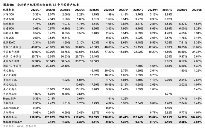 下表展示了绝对收益ETF模拟组合2025年7月持仓资产,权益内部持有红利风格ETF以及医药、有色金属、消费者服务等相关行业ETF,商品内部持有能源化工、豆粕相关ETF。模拟组合中权益资产仓位显著抬升,主要是时序动量角度对于A股观点由持平转向看多。