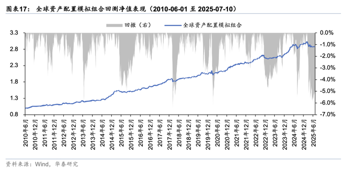 除A股择时模型外,针对目前国内债券资产进入“低利率”时期、利率单边下行趋势减缓、未来波动风险或将上升等情况,我们利用时效性和灵敏性较高的技术分析方法,构建了针对10年期国债利率的多周期复合趋势追踪模型,利率趋势下行时看多长债资产,利率趋势上行时看空长债资产(具体构建方法可参考前期报告《技术分析视角下的利率趋势择时体系》(2025-06-19))。下列图表展现了2024年以来模型的信号值及同期中国10年期国债利率的走势。从结果上看,该模型能较为精准地捕捉利率趋势方向,同时也可以反映出市场情绪的短期变化,兼顾收益和胜率两方面。值得注意的是,模型信号除了正负方向代表多空观点外,其数值大小也可以反映市场趋势的强弱程度,信号值越靠近1,表明模型认为长债利率未来趋势下行的可能性越高。截至2025年7月11日,多周期复合趋势追踪模型的信号为正,表明看多长债资产,但数值录得0.21,相比7月1日的0.91有所下降。