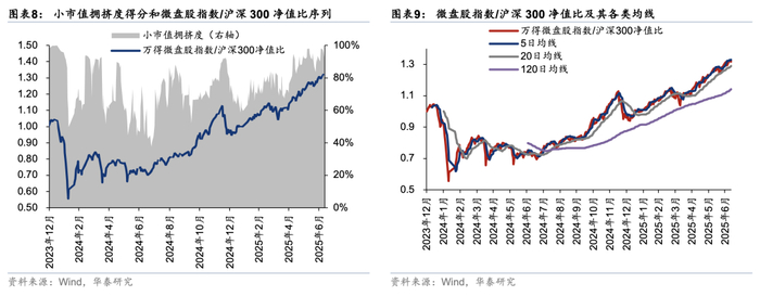 具体操作中,当小市值拥挤度较高时,我们采用(5日,20日)的双均线模型,当万得微盘股指数/沪深300指数的净值比序列5日均线上穿20日均线时,看多小市值风格,当净值比序列5日均线下穿20日均线时,看空小市值风格;当小市值拥挤度较低时,我们的双均线模型参数修改为(20日,120日)的长周期窗口。截至2025年7月11日,小市值风格拥挤度得分保持在90%以上,属于历史相对高位,同时万得微盘股指数/沪深300指数的净值比序列5日均线处于20日均线之上,择时模型整体短期依然看多小市值风格。不过,短周期窗口参数下的双均线模型信号变化较快,建议投资者持续关注,提防风格反转。