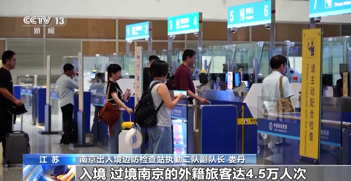 南京出入境边防检查站执勤二队副队长 娄丹:口岸流量旺的背后是政策持续的优化,上半年享受各类免签便利入(过)境南京的外籍旅客达4.5万人次,占入境外籍旅客总数的60.55%。