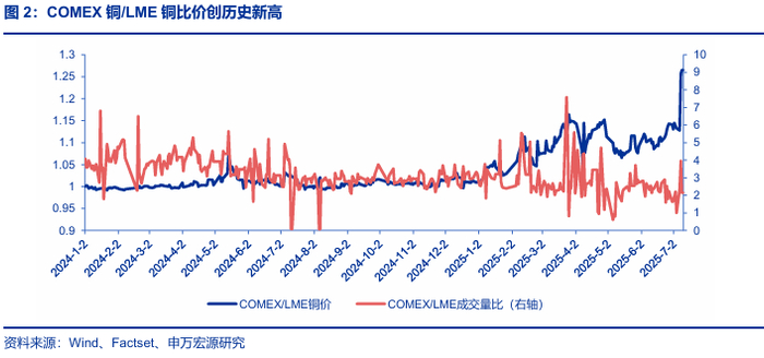 事件:根据中国新闻网,当地时间2025年7月9日,美国总统特朗普宣布美国对铜征收50%的关税,自2025年8月1日起生效。COMEX铜价和COMEX铜/LME铜比价大幅上升。复盘今年以来对铜关税事件对铜价的影响,COMEX铜价和COMEX铜/LME铜比价近乎同向。展望下半年铜价,短期沪铜、LME铜价调整后将迎来较好的配置窗口期,建议密切关注铜价底部布局的机会。