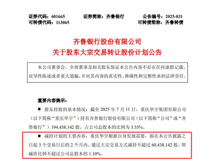 7月13日晚,齐鲁银行发布公告称,公司股东重庆华宇集团有限公司(下称“重庆华宇”)根据自身发展需要,拟在本公告披露之日起 3个交易日后的2个月内,通过大宗交易方式减持不超过60,438,142 股,即减持比例不超过公司总股本的1.10%。