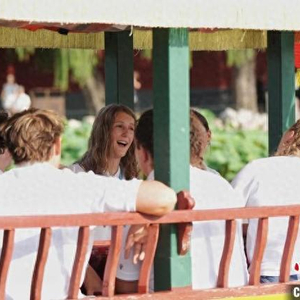 7月13日,来华参加2025年“鼓岭缘”中美青少年合唱周的美国青少年走进北京北海公园。图为合唱团成员在船上合唱《让我们荡起双桨》。中新社记者 张祥毅 摄