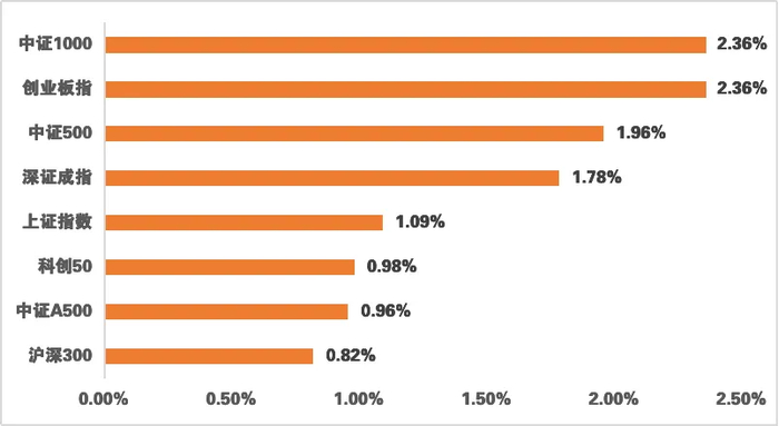 上周A股主要股指收涨。上证指数周涨幅1.09%,深证成指周涨幅1.78%,创业板指周涨幅2.36%,中证A500指数周涨幅0.96%。