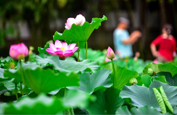 7月13日,不少市民三五成群漫步丰庆公园荷花塘,尽情享受这份夏日美景。(记者 王健)详情:夏日赏荷