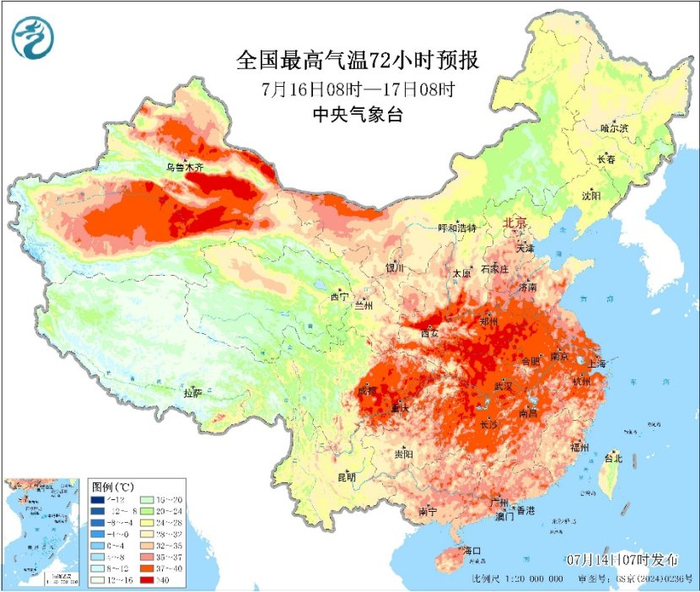 高温方面,未来三天,其影响范围还将保持逐步扩展的状态,15日至16日为高温影响范围最广、强度最强的时段。其中今天,高温将扩展至江南北部,预计华北中南部至江南北部、新疆等地将出现大范围高温天气,河北南部、山东西部、河南大部、山西西南部、陕西关中、湖北北部和西部、重庆大部、四川东部、湖南北部及新疆吐鲁番盆地等地部分地区最高气温有37~39℃,陕西关中、河南中部、新疆吐鲁番盆地等局地可达40℃以上。明后两天,日最高气温可达37℃以上的范围涉及黄淮至江南的大片区域,部分地区气温可超过40℃。