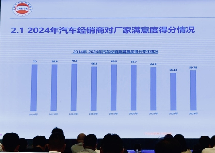 全国工商联汽车经销商商会秘书长邢海涛介绍,刚刚发布的《汽车经销商对生产厂家满意度调研暨汽车经销商生存状况调研报告》显示,围绕“品牌与产品、网络建设、商务政策、投资回报”等核心指标,2024年汽车经销商对主机厂的整体满意度得分为59.78分,同比略有上升,但整体来看仍处于低位。此前,这一满意度得分曾多次达到或接近70分。
