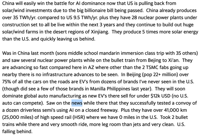 上个月我去了中国(儿子的中学普通话浸入式课程旅行,其他35人也参加了),在从北京到西安的高铁上参观了几座核电站。相比亚利桑那州,中国的核电站发展速度非常快。亚利桑那州除了附近正在兴建的两座台积电晶圆厂外,几乎没有其他基础设施建设进展。在北京(人口超过2200万),道路上超过75%的汽车都是电动汽车,来自几十个我在美国从未见过的品牌(尽管去年在菲律宾马尼拉确实见过几个)。它们很快就会主导全球汽车制造业,因为那里的新型电动汽车售价不到1.2万美元(没有美国汽车可以与之竞争)。在那里看到新闻,他们在一条封闭的高速公路上成功测试了一个由十几辆使用人工智能的无人驾驶半挂卡车组成的车队。此外,他们拥有超过4.1万公里(2.5万英里)的高铁(HSR),而我们美国却没有。在那里坐了两次高铁,非常平稳,腿部空间比喷气式飞机还大,而且非常干净。美国落后了。”