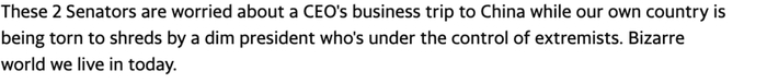 也有的说:“这两位参议员竟然还在为一位CEO的中国商务之行而担忧,而我们自己的国家正被一位受极端分子控制的愚蠢总统撕成碎片。我们如今生活的世界真是奇异。”