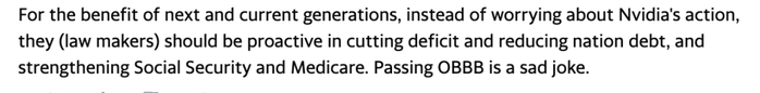 这位有点忧国忧民的感觉,“为了下一代和当代人的利益,他们(立法者)不应该担心英伟达的举动,而更应该积极主动地削减赤字、减少国家债务,并加强社会保障和医疗保险。通过大漂亮法案简直就是一个可悲的笑话。”