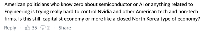 如有的说:“政客们对半导体、人工智能或任何与工程相关的知识懂个der!,他们正竭力控制英伟达以及其他美国科技和非科技公司。这还是资本主义经济吗?还是更像一个封闭的朝鲜式经济?”