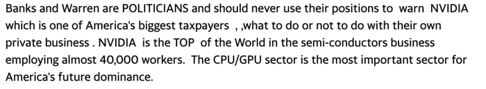 还有的说:“班克斯和沃伦是政客,他们不应该利用自己的职位来警告英伟达(它是美国最大的纳税人之一)如何处理自己的私人业务。 NVIDIA是全球半导体行业的领军企业,拥有近4万名员工。CPU/GPU领域是美国未来主导地位的最重要领域。