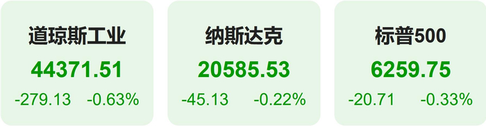 截至上周五收盘,标普500指数跌0.33%,报6259.75点;道琼斯指数跌0.63%,报44371.51点;纳斯达克指数跌0.22%,报20585.53点。
