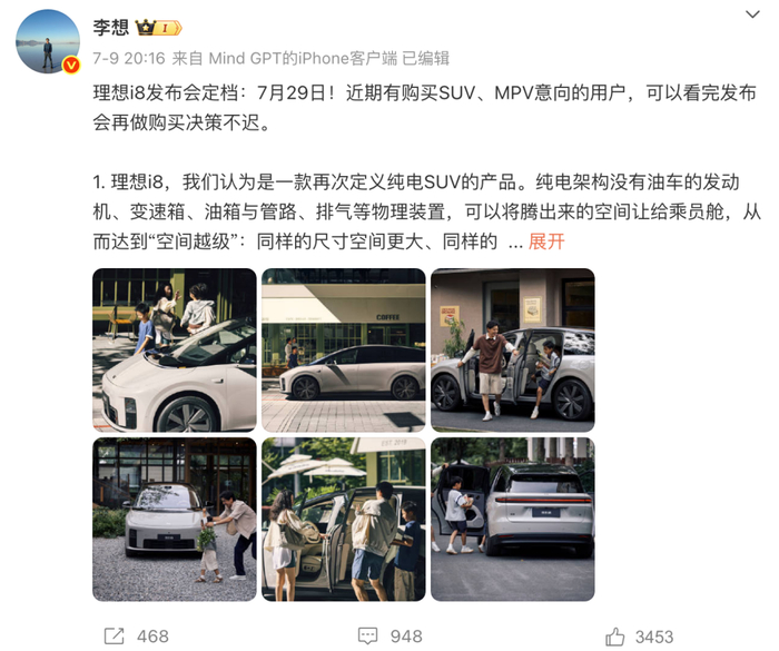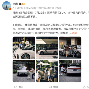 日前,理想汽车官宣,旗下首款纯电动SUV——理想i8将于7月29日上市。综合此前报道,理想i8定位中大型SUV,是一款家庭六座纯电SUV,将会全系标配5C三元锂电池、双电机智能四驱和激光雷达等,预计定价在35-40万元,竞争对手包括问界M9纯电动版和蔚来ES8等,新车将于7月17日开始预订。
