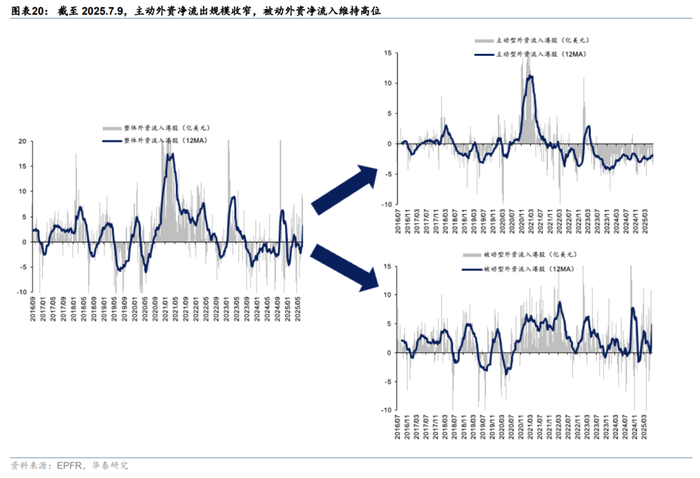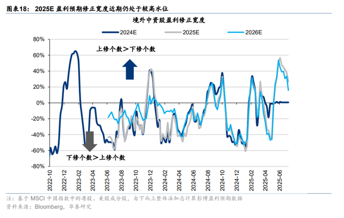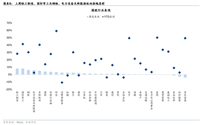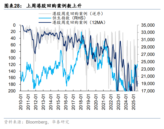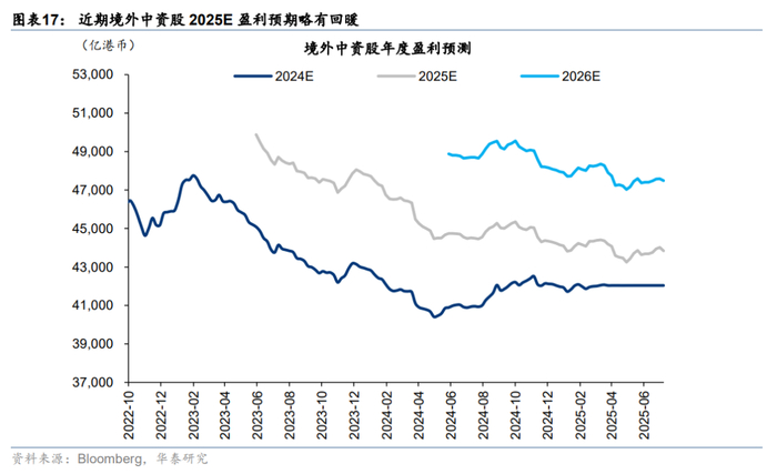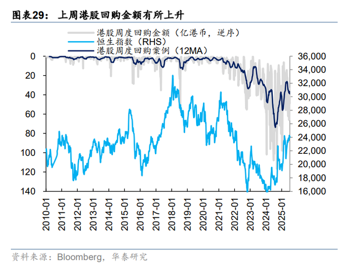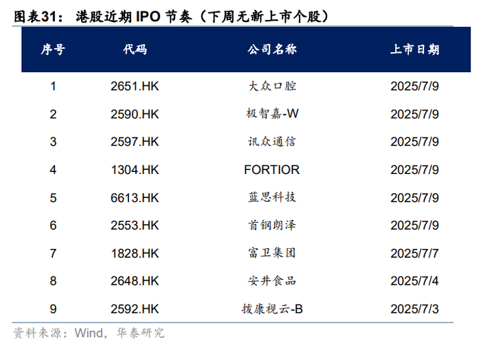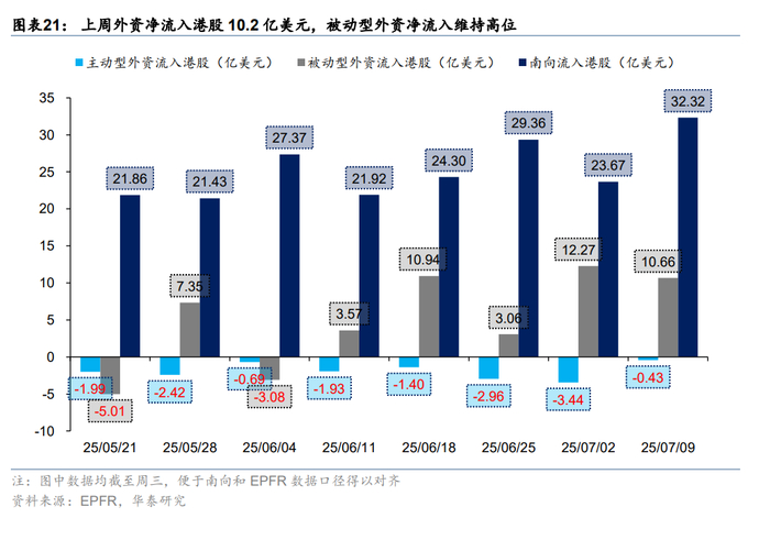 关税再起风波,但市场相对脱敏。上周8日凌晨特朗普宣布已对14个国家发出关税函,主要涉及亚洲国家,本次调整暂未包含对华关税。11日中美外长在吉隆坡会晤,“一致认为会晤是积极、务实和建设性的”。在上述事件影响下,港股市场体现出相当韧性。上周南向资金净流入241亿人民币,环比前一周提升超百亿。外资也进一步回流港股,截至周三EPFR口径下外资净流入海外中资股12亿美元(vs 前一周净流入9.1亿美元)。往后看,参考华泰宏观团队预测,估计美股对华关税最终仍在依然在30%-40%,关税预期变化不多,更重要的是何时“靴子落地”,因此市场对关税问题也正在逐渐脱敏。