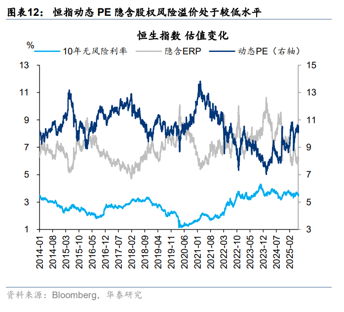 因此,我们对未来港股市场有如下两点判断:1)市场波动率可能继续走高。当前恒指历史波动率位于去年“924”行情以来的最低水平,内外政策变化都可能导致市场波动率上升,因此需重视总体仓位水平控制。2)行业轮动重要性上升。港股前期涨幅较大的新消费等行业近期均出现不同程度回调,市场或进入资金再配置期。景气改善作为市场的基本面支撑,提供胜率;进一步考虑到估值对景气改善的计入程度,观察赔率,我们进行了以下筛选:1)消费者服务、耐用消费品、技术硬件与设备2025~2026年ROE本身水平较高,且市场预计可能进一步修复;2)在业绩改善的同时考虑估值水平,软件服务、消费者服务、食品饮料等具有性价比,科技硬件、耐用消费品并未明显高估。