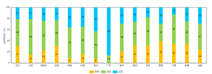 附图2 7月13日分省20厘米土壤墒情统计(站点百分比)