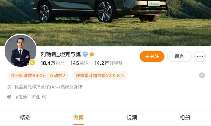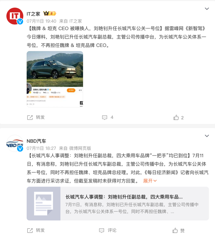 针对相关报道,长城汽车暂未公开回应,刘艳钊本人也未针对职位变动作出回应,目前刘艳钊在微博上的认证仍为“魏品牌总经理兼任TANK品牌总经理”,而冯复之、常尧两位管理人员暂未开通社交媒体账号。不过,据知情人士透露,刘艳钊确实已升任主管传播中台的副总裁,且已有一段时间。