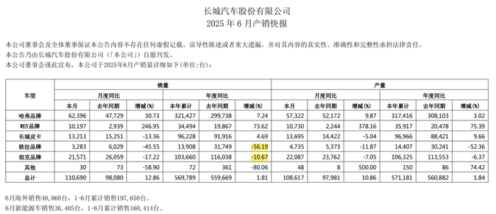 今年上半年,长城汽车销量呈现微增长态势。官方数据显示,长城汽车1至6月累计销量约56.9万辆,同比增长1.84%。其中,哈弗品牌、魏牌均实现正增长,特别是魏牌,得益于新款蓝山的上市,使其上半年销量同比暴增73.62%。