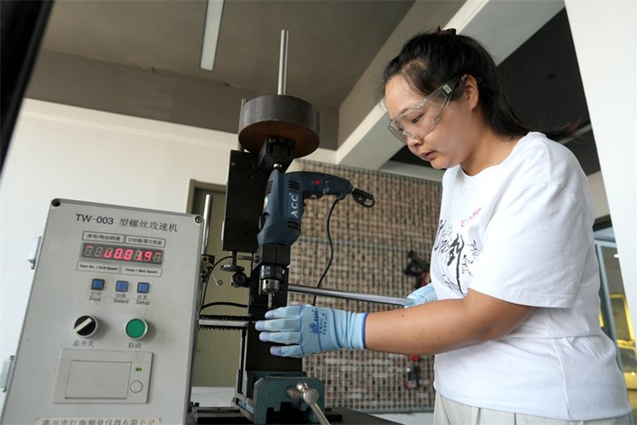 7月7日,位于邢台市任泽区龙泉剑集团-厚力五金产业园的共享车间内,工人在检验干壁钉的攻速。