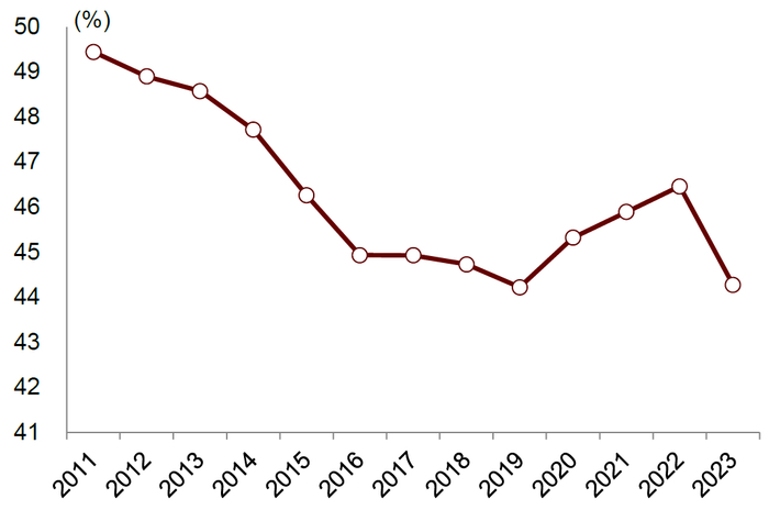 消费市场依然广阔,居民消费率有提升空间。中国居民消费占GDP比重较发达国家仍有一定差距,但近年来整体呈现上升趋势。据世界银行数据,2023年中国居民消费率(居民消费占GDP比重)仅39.1%,仍低于美国、英国、德国、日本、韩国等国家,我们认为随着中国经济进一步进入高质量发展阶段,居民消费率未来仍有较大的提升空间。