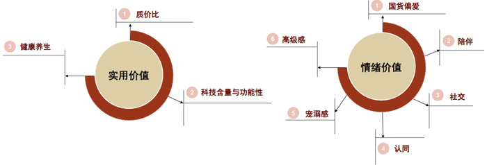 ► 需求端的变化是推动新消费品牌或品类诞生的主要因素,消费者喜爱度及其变化是衡量新消费公司投资价值的首要标准。实用价值(质价比、科技含量与功能性、健康养生等)和情绪价值(国货偏爱、陪伴、社交、认同、宠溺感、高级感等)都是从需求端能吸引和打动消费者的创新突破点。