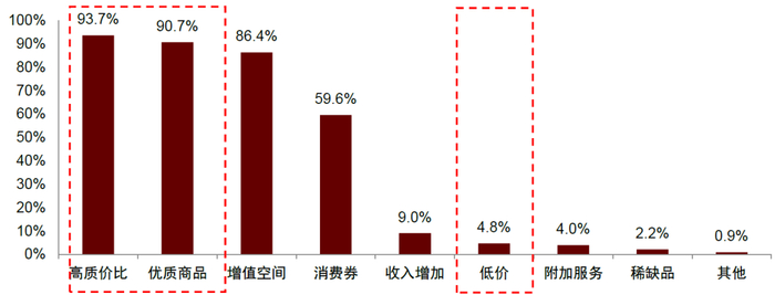 伴随中国经济转入高质量发展航道、经济增速换挡,消费者的消费观念和消费行为越来越趋于理性,他们愈发减少冲动消费、更加追求质价比。消费者既不接受“无理由的溢价”,但也不接受“无品质的低价”,而是强调消费的每一分钱都花在使用价值上。据第一财经发布的《2023消费趋势观察》,“高质价比”与“优质商品”为促进居民消费最主要的两个因素,占比分别达93.7%和90.7%,而单纯的“低价”仅占比4.8%。