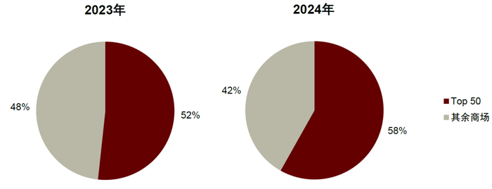 消费者近年来愈发看重“消费体验”,而线下商圈和门店作为城市公共空间,天然具备更强的消费者互动属性。同时,越来越多的商业体通过翻新改造、打造创新设计、引入高势能品牌组合、举办创意营销活动等方式持续升级,头部优质商圈也已展现出较为突出的集客和销售能力。据联商网不完全统计数据显示,2024年中国Top 50商场销售额占比达58%,较2023年进一步提升6个百分点。